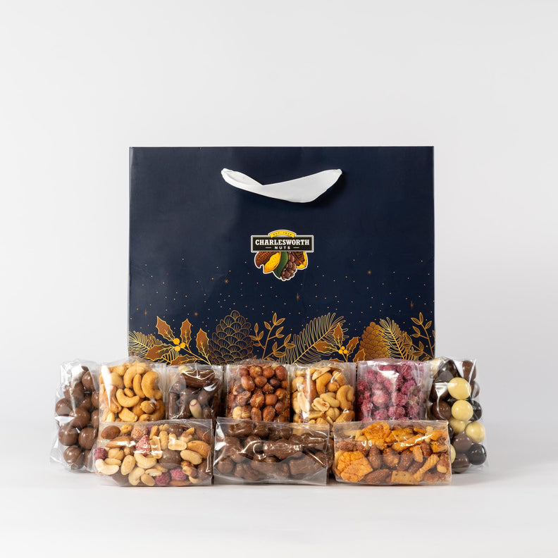 This Christmas, gifting is easier than ever with our beautifully designed Gift Bags, no wrapping needed! Each bag is filled with the freshest nuts, premium dried fruits, and decadent chocolates, making them the perfect corporate gift.