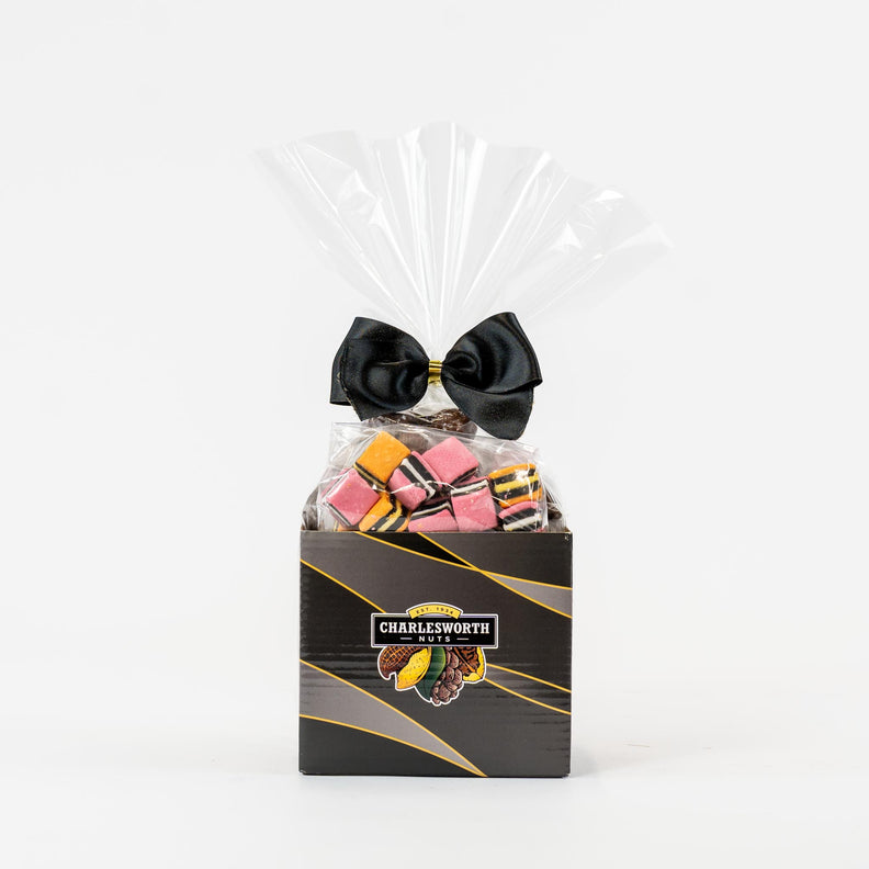 All our gift baskets are beautifully hand-wrapped in clear cellophane, with the base filled with carefully measured amounts of recyclable cardboard to enhance the presentation of the nuts and chocolates.