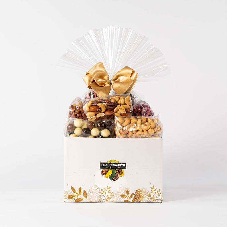 All of our gift baskets come beautifully hand wrapped in clear cellophane. The base is filled with measured amounts of eco-friendly, recyclable cellophane in order to highlight the nuts and chocolates.