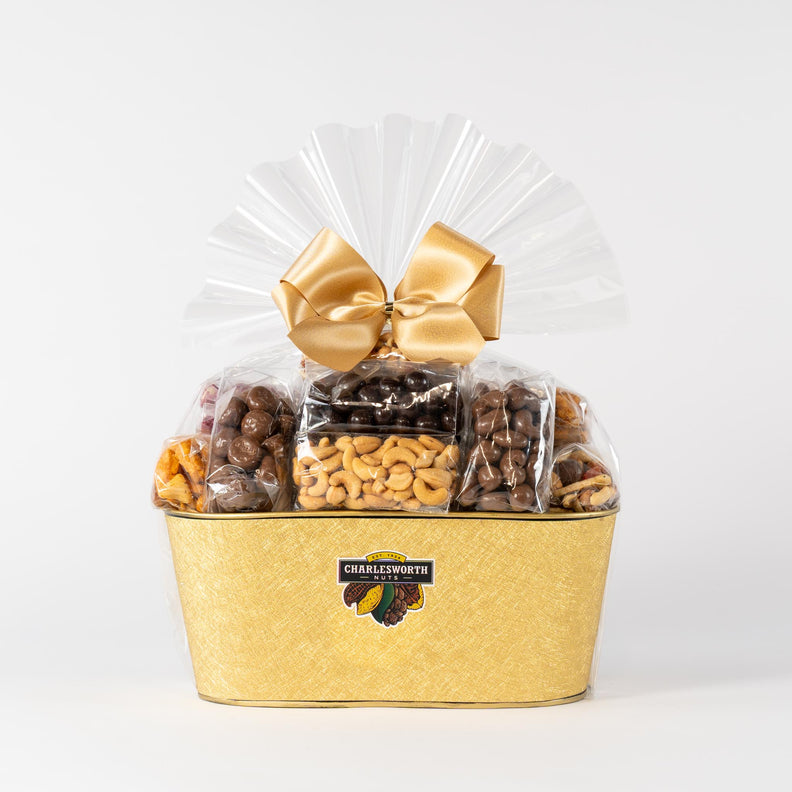 All of our gift baskets come beautifully hand wrapped in clear cellophane. The base is filled with measured amounts of eco-friendly, recyclable cellophane in order to highlight the nuts and chocolates.