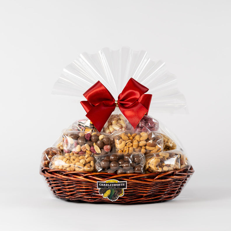 All of our gift baskets come beautifully hand wrapped in clear cellophane. The base is filled with measured amounts of eco-friendly, recyclable cellophane in order to highlight the nuts and chocolates.