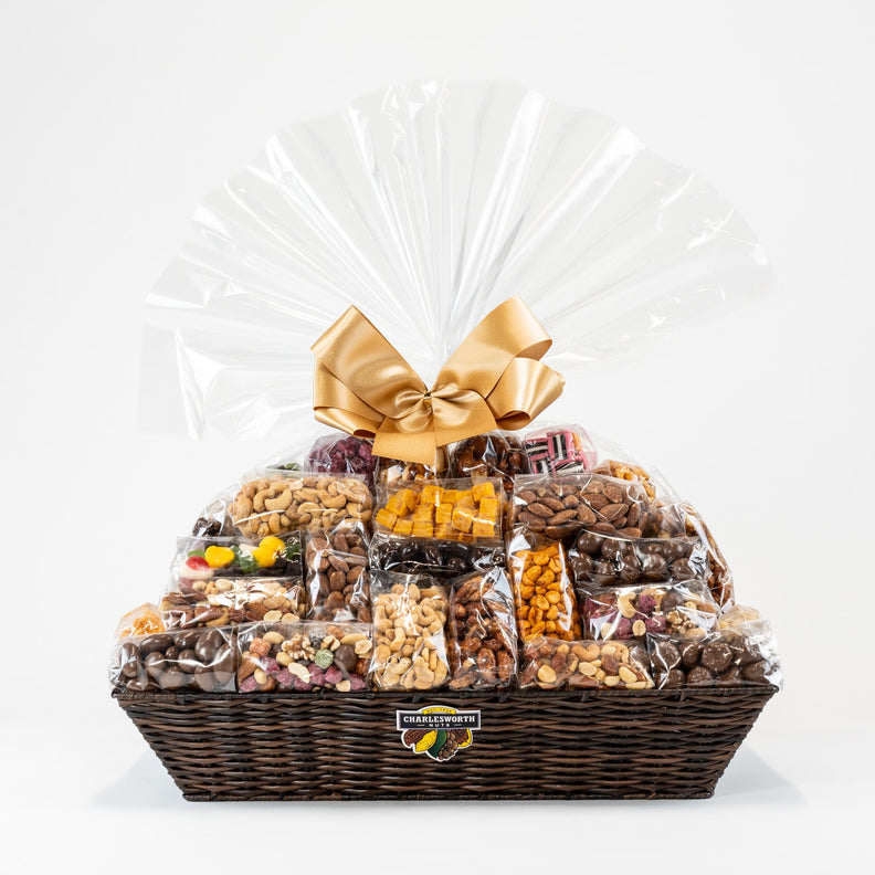 All of our gift baskets come beautifully hand wrapped in clear cellophane. The base is filled with measured amounts of eco-friendly, recyclable cellophane in order to highlight the nuts and chocolates.